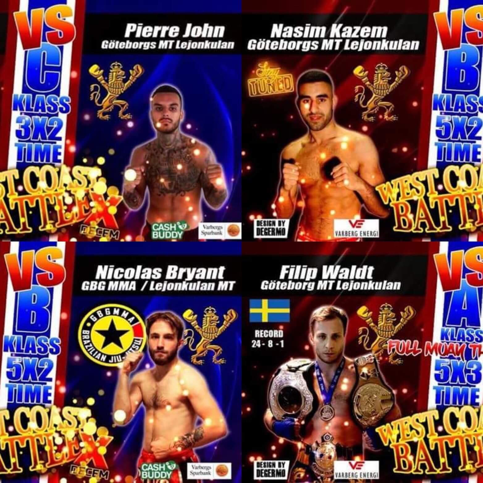 Fyra stycken fighters från Lejonkulan närvarade idag på galan West Coast Battle 10 i Varberg. Vi är stolta över att kunna meddela att alla fyra fighters från Lejonkulan vann sina matcher idag och bjöd på fantastisk underhållning!